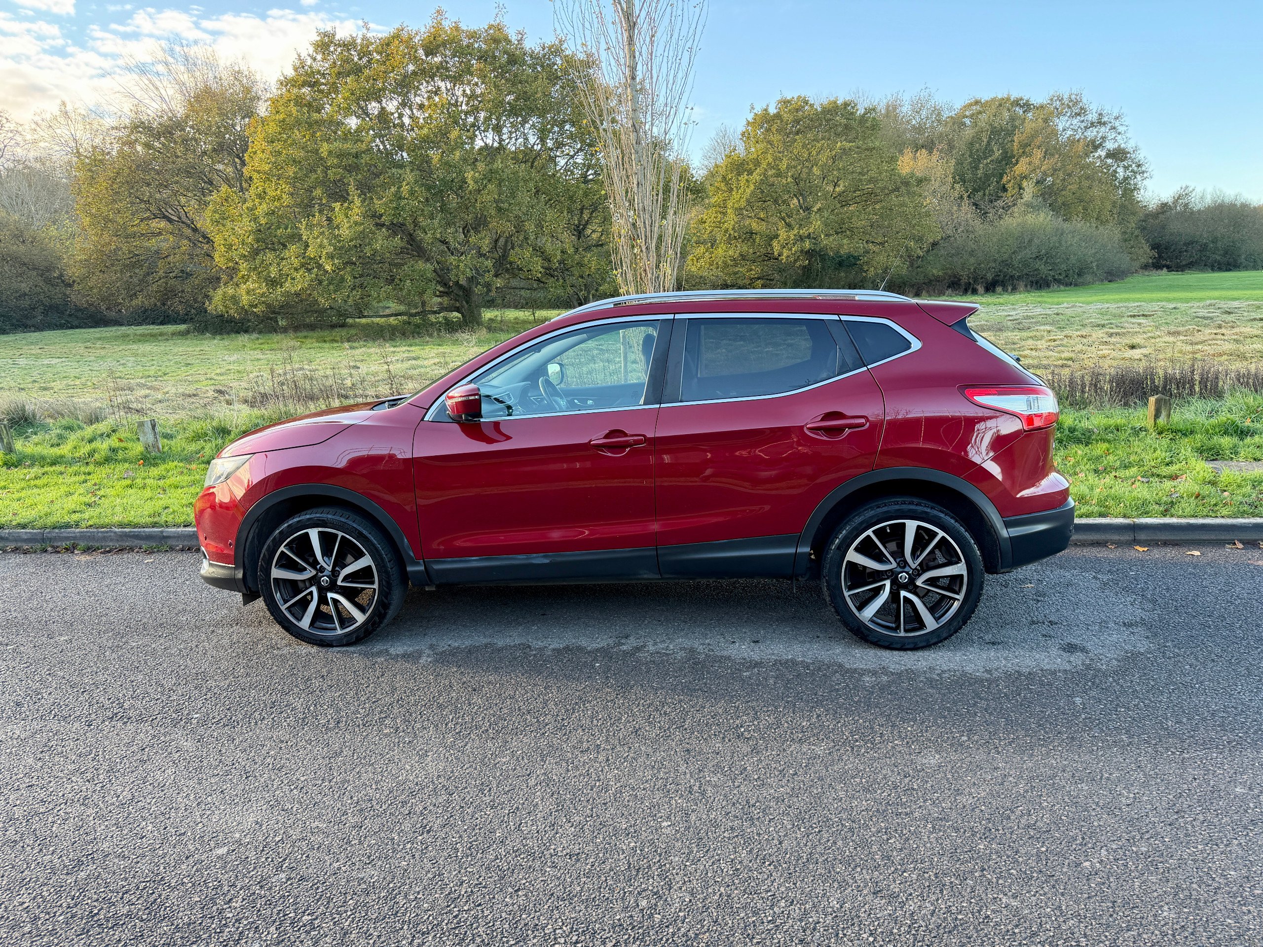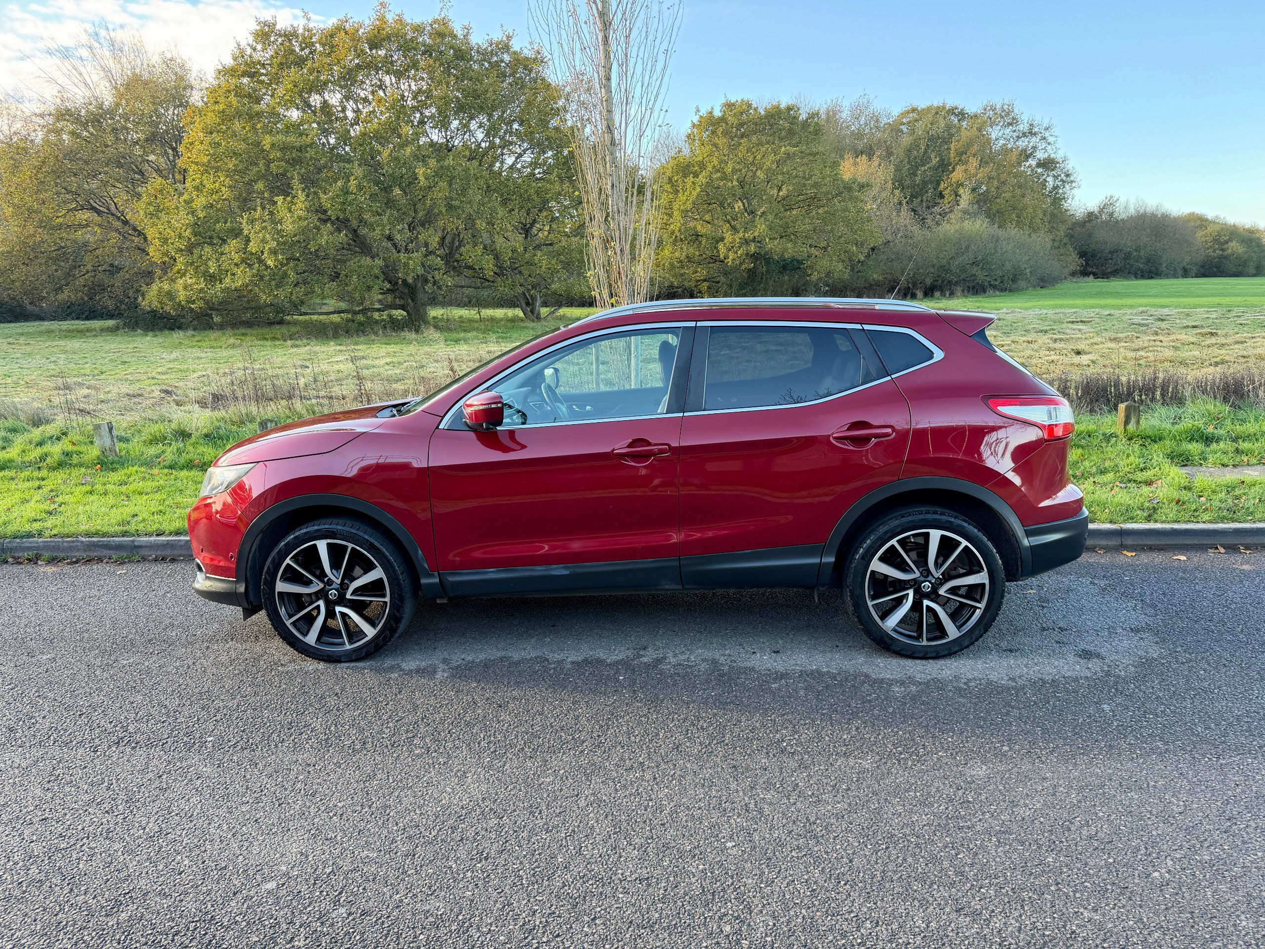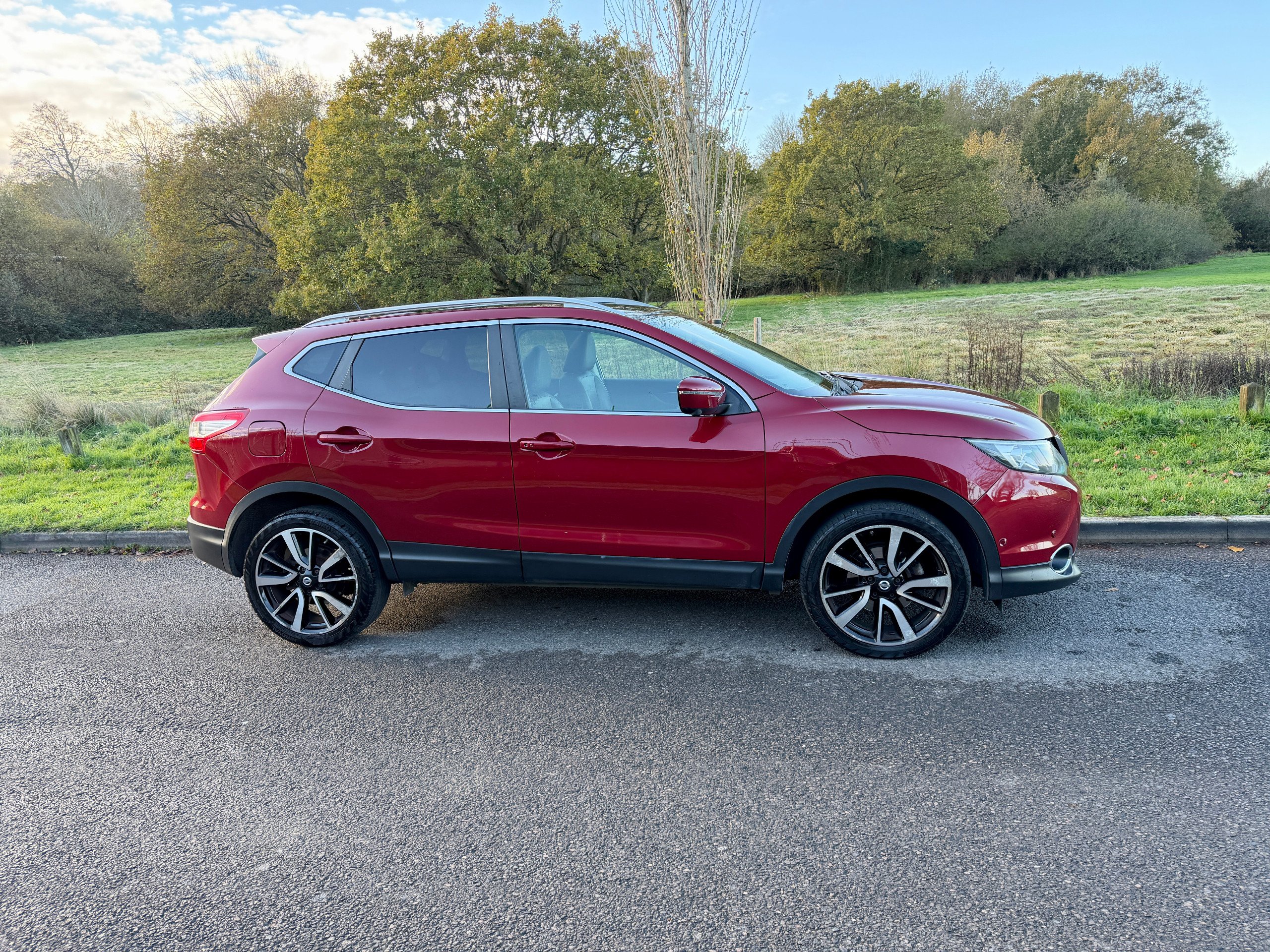 **REDUCED** was 7995 - ULEZ COMPLIANT - 17 Reg - New Red with Charcoal Cloth Trim, This lovely Qashqai comes with a very high specification which includes: Fuzz Size panoramic Glass Sunroof, Factory Colour Satellite Navigation, 360' Reversing Camera, DAB Radio, Bluetooth Audio, Bluetooth Phone, Dual Climate Control, Cruise Control, Trip Computer, CD Player with Fingertip Controls, Power Folding Mirrors, Auto Lights, Auto Dipping Mirror, Leather Steering Wheel, Airbags, ISO-Fix Seating, 18" Alloy Wheels, Front Fogs, comes with a Full Nissan Main Dealer Service History (8 services) and a nice long MOT until the 30th July 2026 with no advisories, really a very nice looking car in this gorgeous colour and is complemented perfectly by its super high specification and lovely service records, this car boasts up to 78 MPG and is ULEZ COMPLIANT, drives superbly so any inspection welcome, HPI Clear, Part Exchange up or down welcome. **Debit/Credit Cards Accepted** **Open 6 Days a week** **POOR CREDIT NO PROBLEMS - Finance available (subject to status)** (*Sometimes we may still reserve the right to not offer unaccompanied test drives)